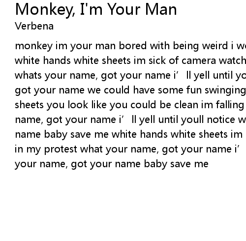| monkey im your man bored with being weird i wont make a sound? im lookin at me white hands white sheets im sick of camera watching im falling in my protest whats your name, got your name i’ll yell until youll notice whats your name, got your name we could have some fun swinging from a string white hands white sheets you look like you could be clean im falling in my protest whats your name, got your name i’ll yell until youll notice whats your name, got your name baby save me white hands white sheets im sick of camera watching im falling in my protest what your name, got your name i’ll yell until youll notice whats your name, got your name baby save me |