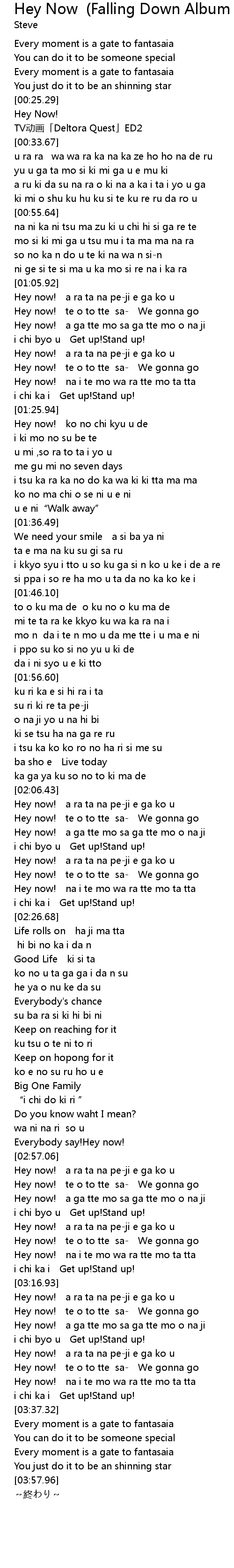 | [01:20.94] | Hey now! na i te mo wa ra tte mo ta tta |