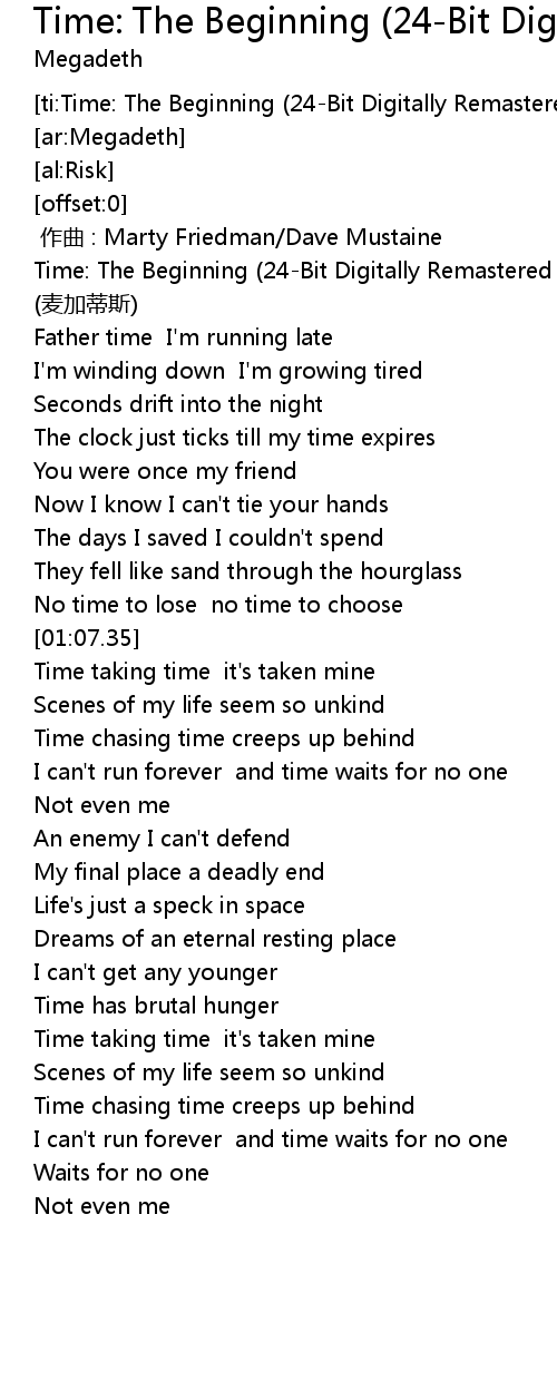 | [00:00.00] | Time: The Beginning (24-Bit Digitally Remastered 04) - Megadeth (麦加蒂斯) |