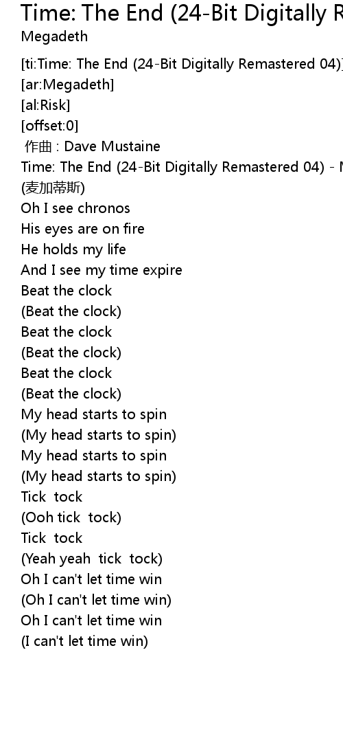 | [00:00.00] | Time: The End (24-Bit Digitally Remastered 04) - Megadeth (麦加蒂斯) |