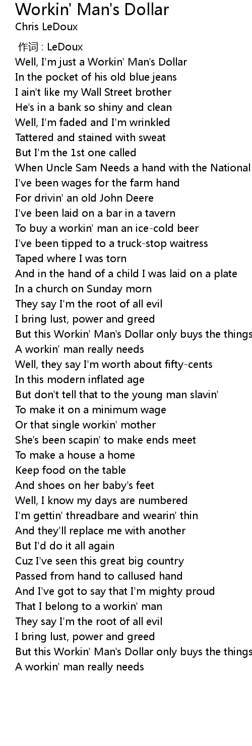 | [00:12.63] | Well, I' m just a Workin' Man' s Dollar |