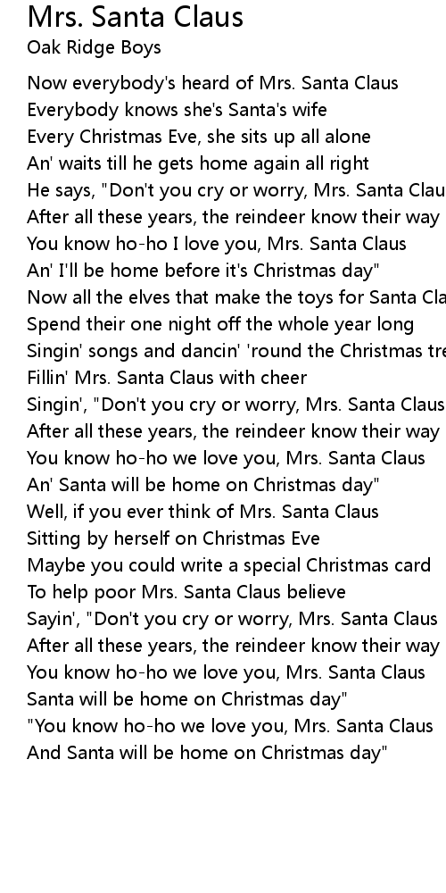 Singin', "Don't you cry or worry, Mrs. Santa Claus |
