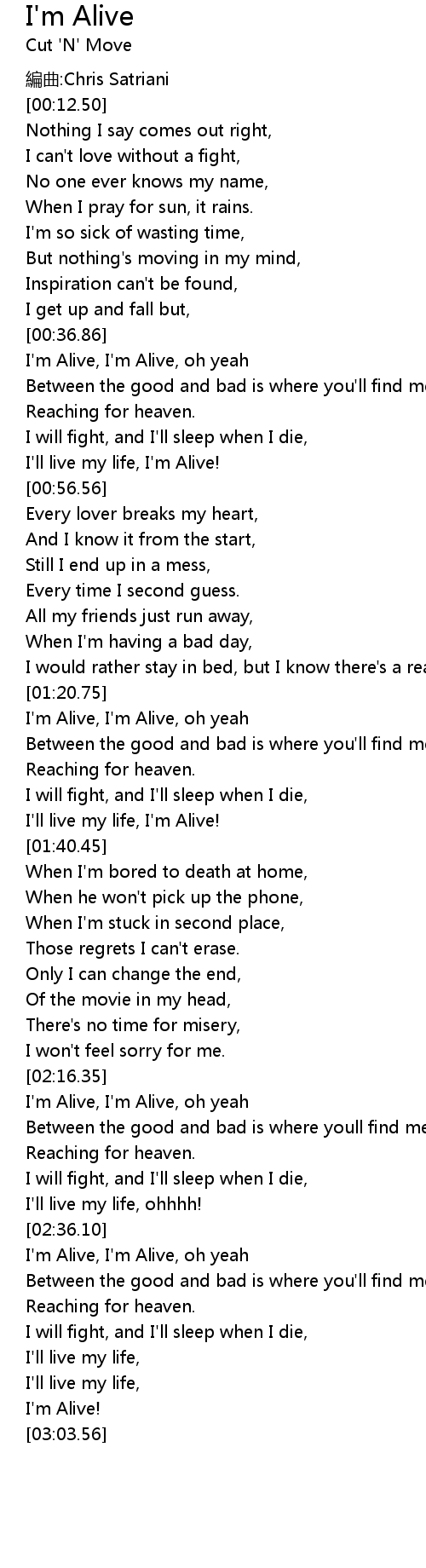 | [02:16.98] | I'm Alive, I'm Alive, oh yeah |