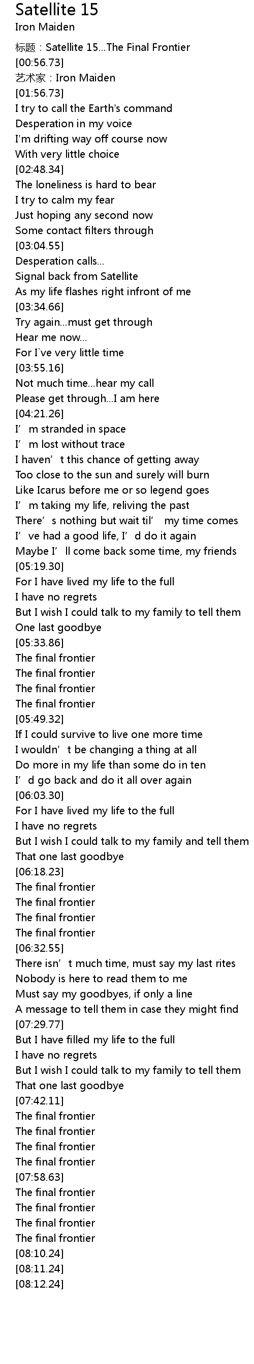 | [00:00.00] | 标题:Satellite 15...The Final Frontier |