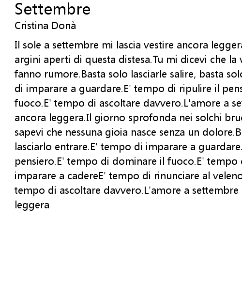 | Il sole a settembre mi lascia vestire ancora leggera,il fiume riposa negli argini aperti di questa distesa.Tu mi dicevi che la verità e la bellezza non fanno rumore.Basta solo lasciarle salire, basta solo lasciarle entrare.E' tempo di imparare a guardare.E' tempo di ripulire il pensiero.E' tempo di dominare il fuoco.E' tempo di ascoltare davvero.L'amore a settembre mi ha fatto sentire ancora leggera.Il giorno sprofonda nei solchi bruciati di questa distesa.Tu lo sapevi che nessuna gioia nasce senza un dolore.Basta solo farlo guarire, basta lasciarlo entrare.E' tempo di imparare a guardare.E' tempo di ripulire il pensiero.E' tempo di dominare il fuoco.E' tempo di ascoltare davveroE' tempo di imparare a cadereE' tempo di rinunciare al velenoE' tempo di dominare il fuocoE' tempo di ascoltare davvero.L'amore a settembre mi ha fatto sentire ancora leggera |