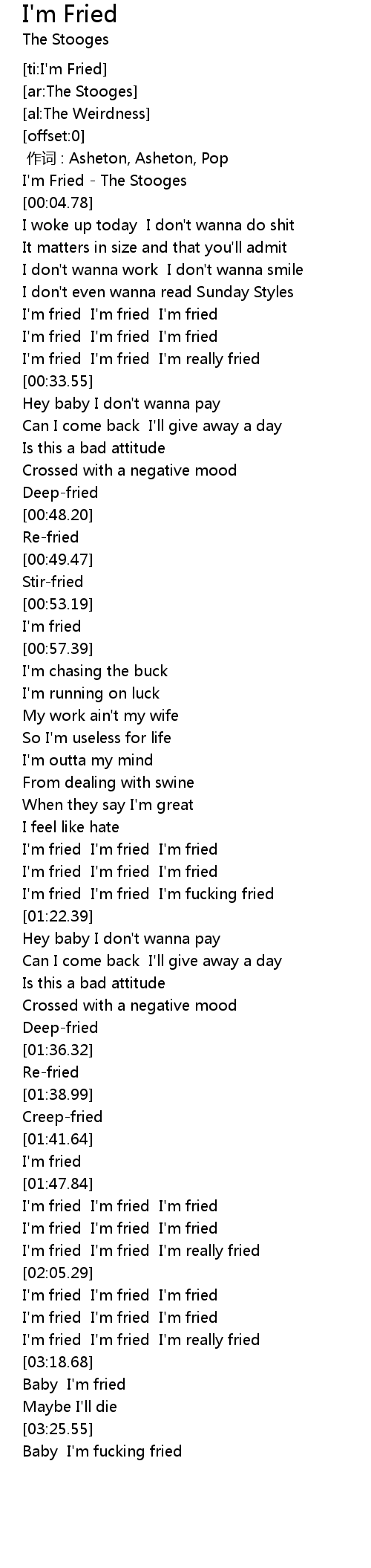| [00:02.11] | I' m Fried The Stooges |