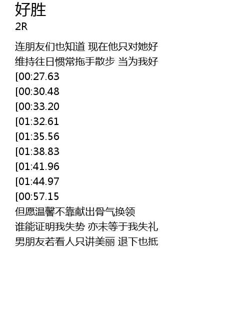 | [02:07.46][01:32.61][00:40.11] | 是我太好胜 爱得不留情 |