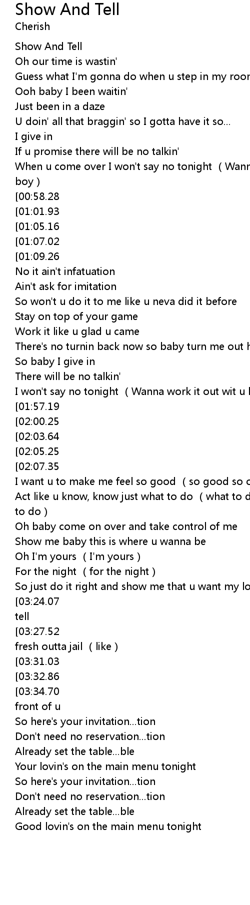 | [03:38.48][03:24.07][03:09.39][02:55.18] | So baby are u down for a lil' show and tell |