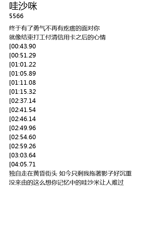| [03:57.07][02:59.26][01:43.62] | 故作潇洒的我实在狼狈 |