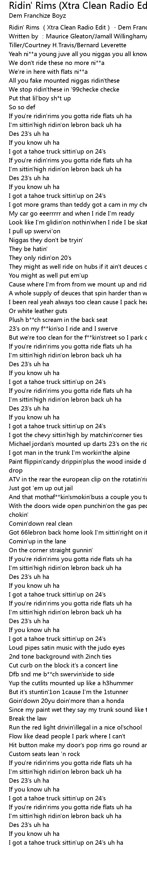 | [00:00.277] | Ridin' Rims Xtra Clean Radio Edit Dem Franchize Boyz |