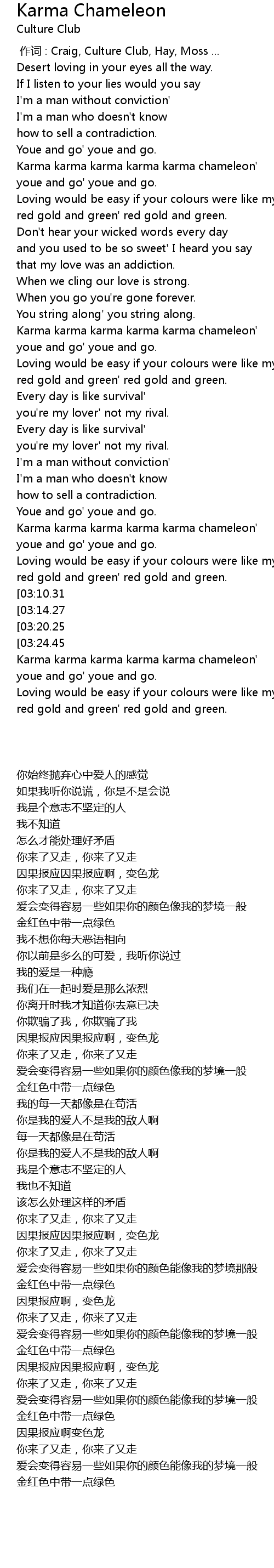 | [03:51.90][03:10.31] | Karma karma karma karma karma chameleon' |