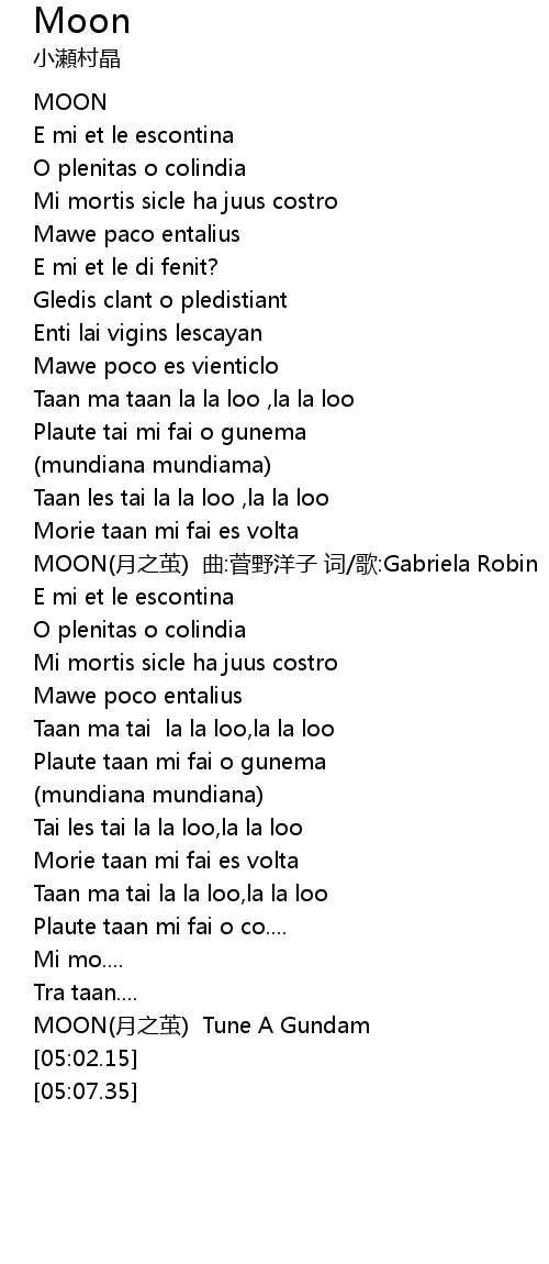 | [02:02.54] | MOON yuè zhī jiǎn qū: jiān yě yáng zi cí gē: Gabriela Robin |