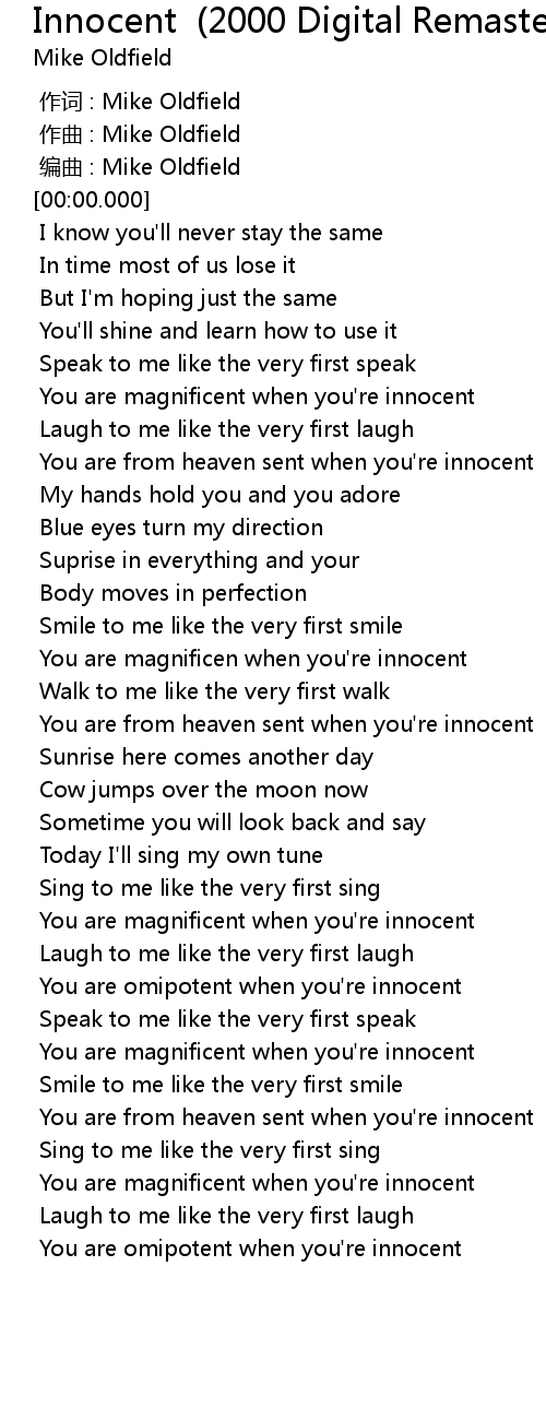 | [00:39.593] | You are from heaven sent when you' re innocent |