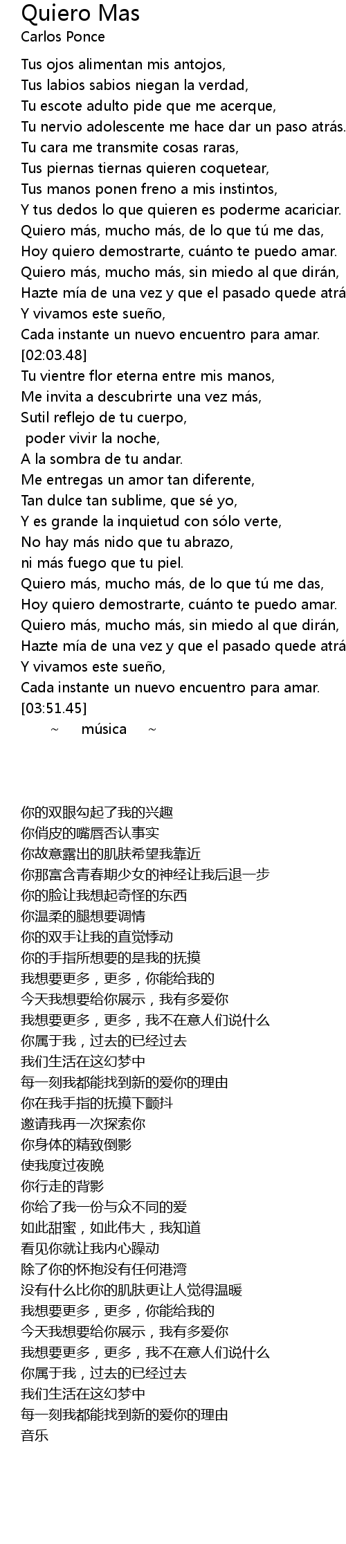 | [01:35.15] | Quiero má s, mucho má s, sin miedo al que dirá n, |
