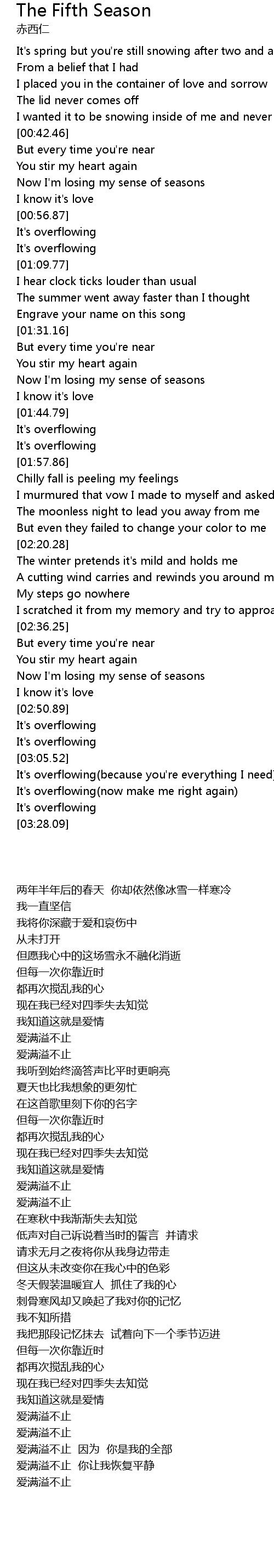 | [00:47.98] | Now I'm losing my sense of seasons |
