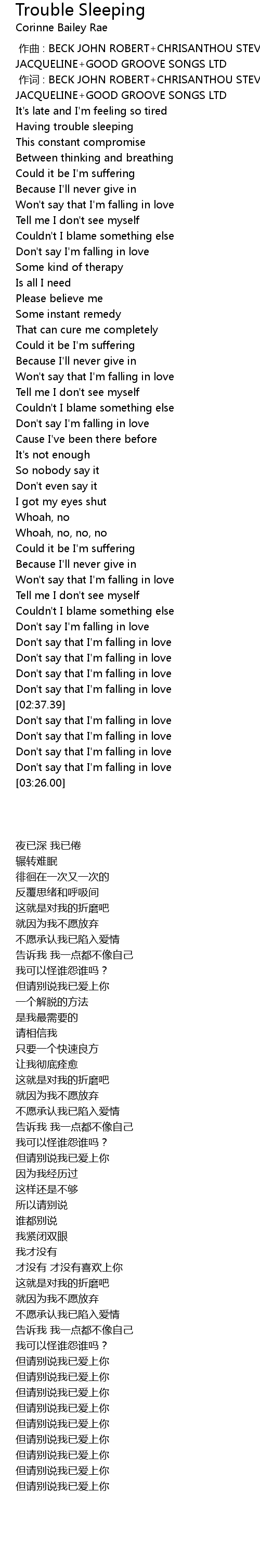 | [00:01.00] | zuò cí : BECK JOHN ROBERT CHRISANTHOU STEVEN BAILEY RAE CORINNE JACQUELINE GOOD GROOVE SONGS LTD |
