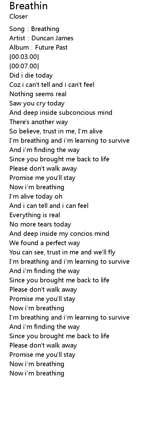 | [00:41.20] | I' m breathing and i' m learning to survive |
