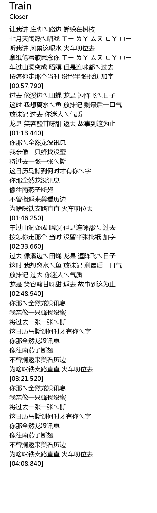 | [01:42.070] | 为啥咪铁支路直直 火车叨位去 |