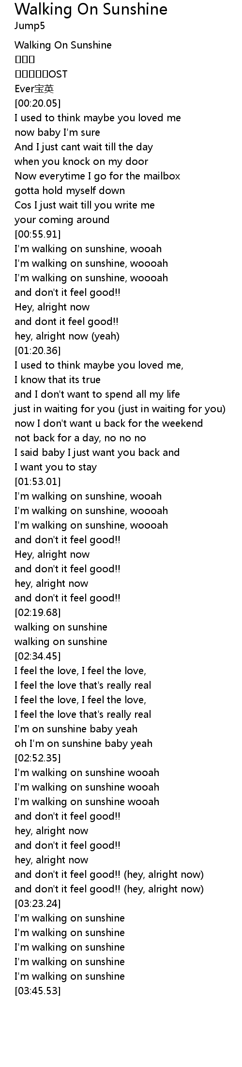| [03:23.73] | I'm walking on sunshine |