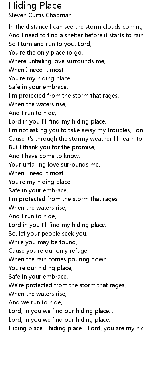 Hiding place... hiding place... Lord, you are my hiding place... |