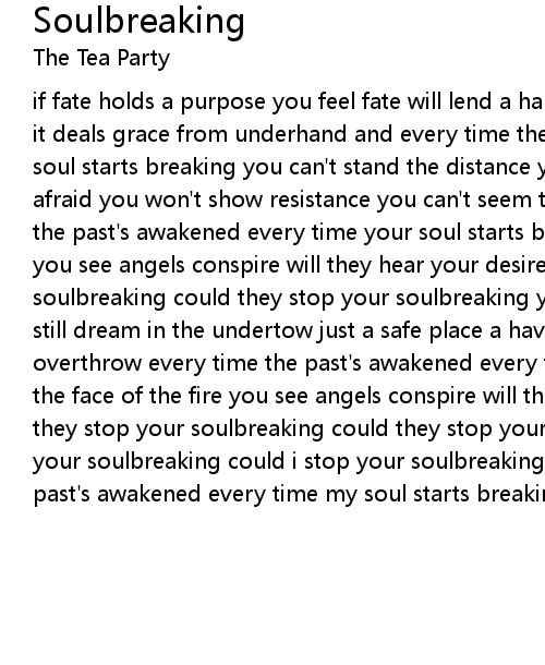 if fate holds a purpose you feel fate will lend a hand it saves face deserts you it deals grace from underhand and every time the past's awakened every time your soul starts breaking you can't stand the distance you can't stand to not be afraid you won't show resistance you can't seem to run away because every time the past's awakened every time your soul starts breaking in the face of the fire you see angels conspire will they hear your desires will they stop your soulbreaking could they stop your soulbreaking you won't say you're hurting you still dream in the undertow just a safe place a haven just a kind face just to overthrow every time the past's awakened every time your soul starts breaking in the face of the fire you see angels conspire will they hear your desires will they stop your soulbreaking could they stop your soulbreaking will they stop your soulbreaking could i stop your soulbreaking please love every time the past's awakened every time my soul starts breaking |