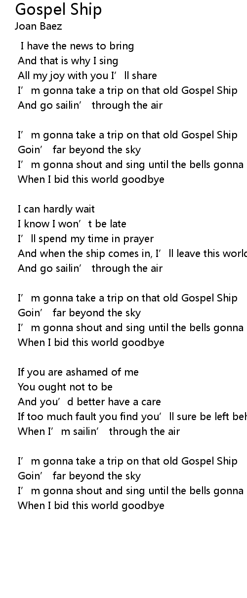 | I’m gonna take a trip on that old Gospel Ship | |