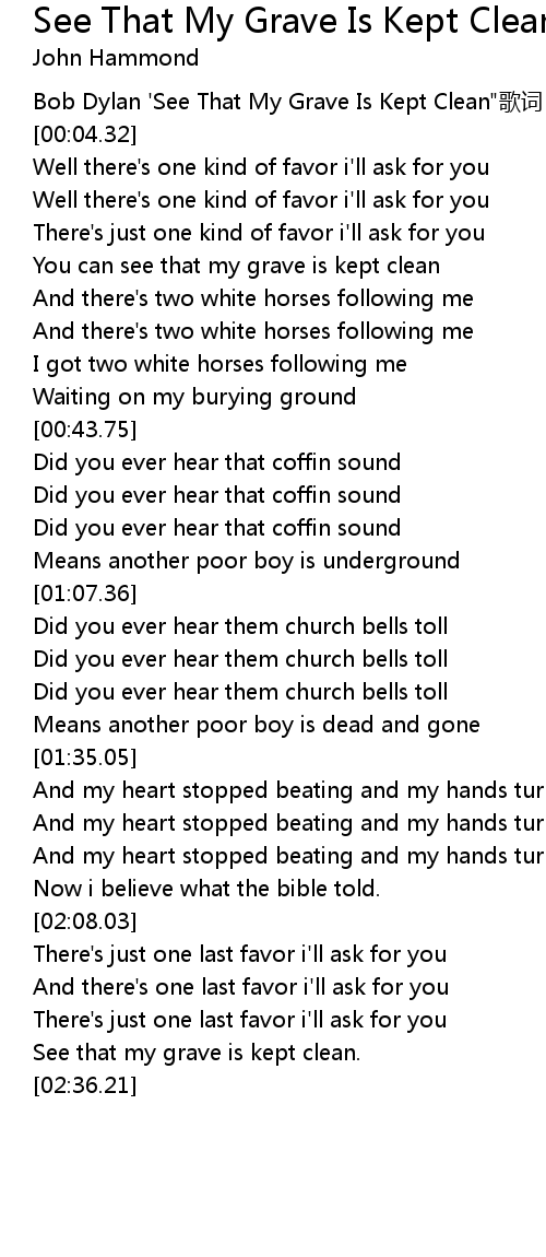 | [00:01.89] | Bob Dylan 'See That My Grave Is Kept Clean"歌词 |
