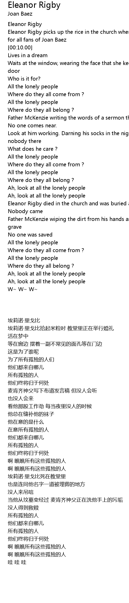 | [01:21.27] | Eleanor Rigby died in the church and was buried along with her name |