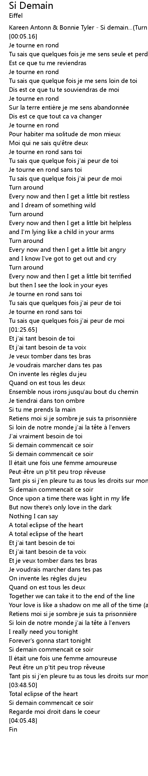 | [00:00.00] | Kareen Antonn & Bonnie Tyler - Si demain...(Turn around) |