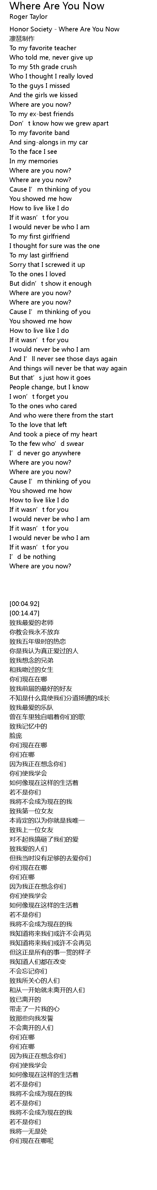 | [00:04.92] | Honor Society Where Are You Now |