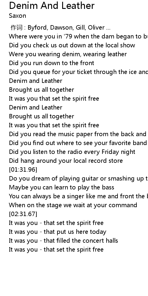 | [00:28.16] | Were you wearing denim, wearing leather |