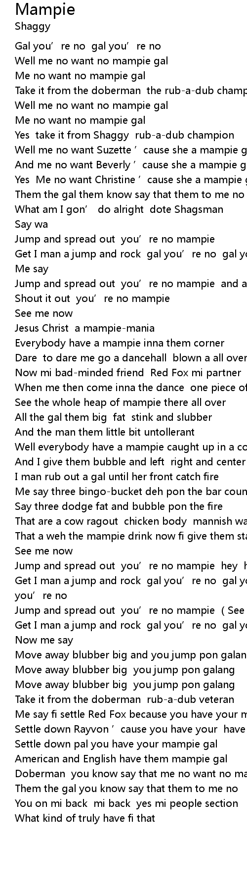 | [00:15.17] | Me no want no mampie gal |