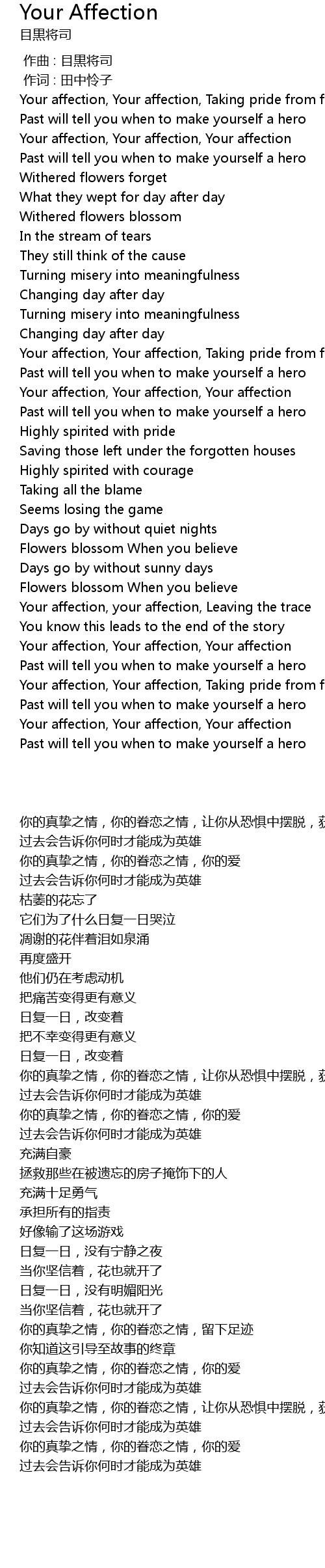 | [00:00.15] | Your affection, Your affection, Taking pride from fear |