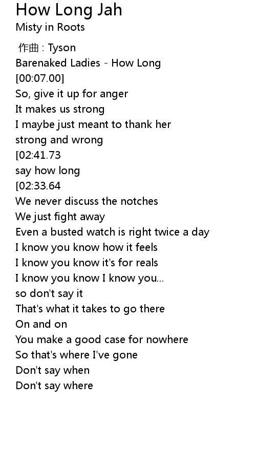| [02:45.61][02:33.64][01:27.32][01:14.98][00:45.08] | How long |