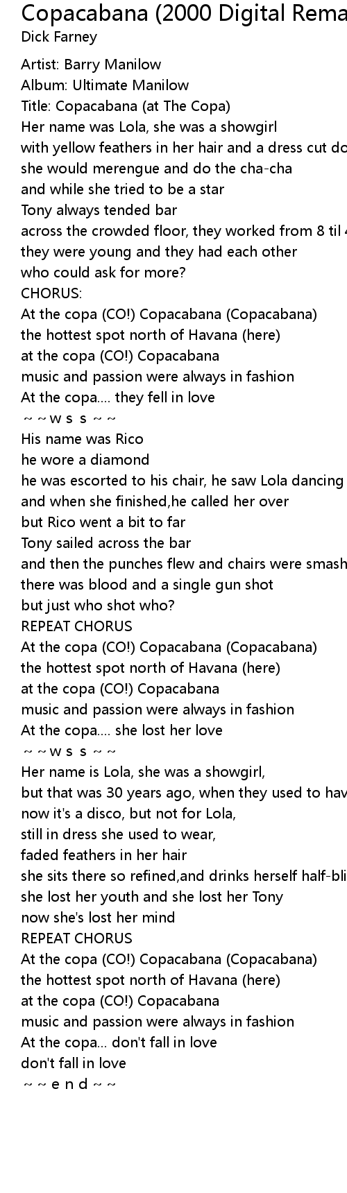 | [00:21.80] | Title: Copacabana (at The Copa) |
