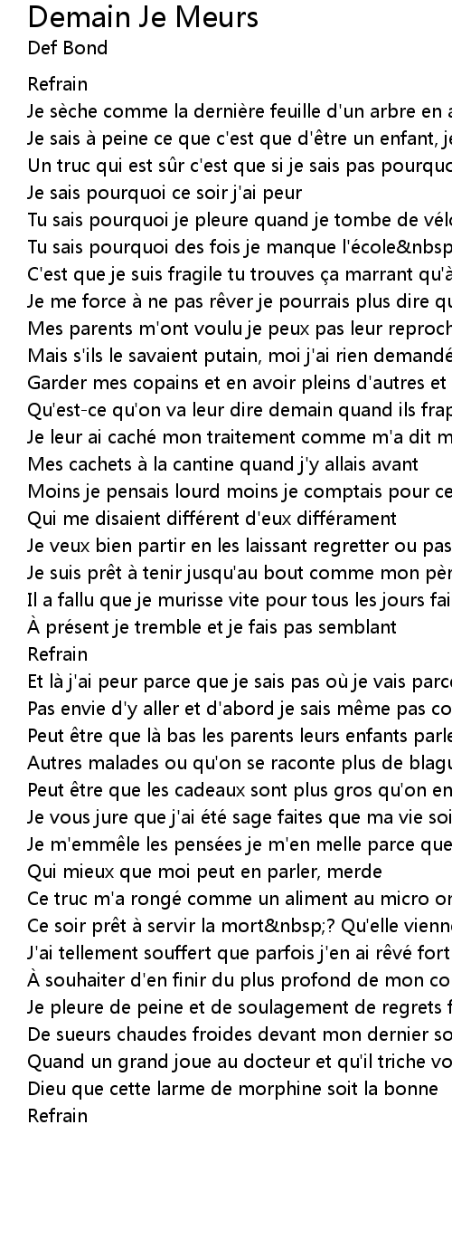 | Un truc qui est s r c' est que si je sais pas pourquoi demain je meurs | |