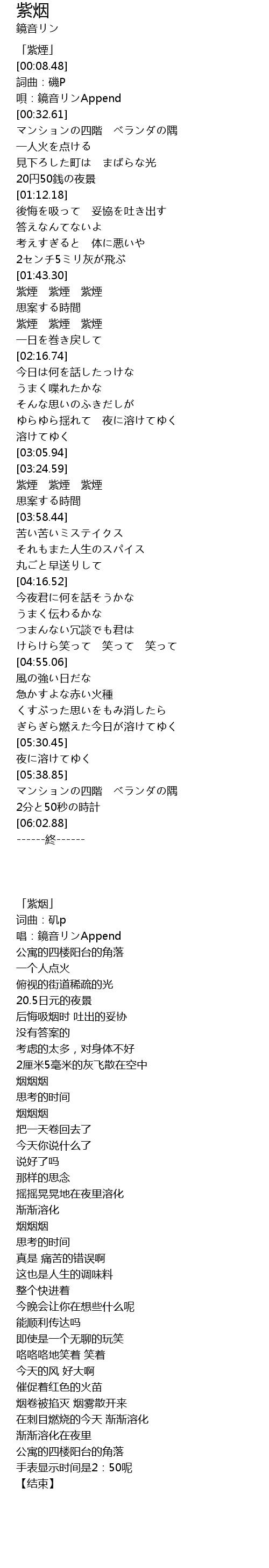 | [01:59.85] | 紫煙 紫煙 紫煙 |