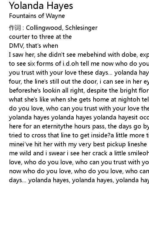 | I saw her, she didn' t see mebehind with dobe, explaining patiently and she needs to see six forms of i. d. oh tell me now who do you love, who do you love, who can you trust with your love these days... yolanda hayes yolanda hayescourter to four, the line' s still out the door, i can see in her eyes, she' s heard it all beforeshe' s lookin all right, despite the bright florescent lights, and i wonder what she' s like when she gets home at nightoh tell me now who do you love, who do you love, who can you trust with your love these days... yolanda hayes yolanda hayes yolanda hayes yolanda hayesit occures to me suddenly she' s been here for an eternitythe hours pass, the days go by, well has anybody really tried to cross that line to get inside? a little more time, and now the girl is minei' ve hit her with my very best pickup lineshe puts down my file, stares at me wild and i swear i see her crack a little smileoh tell me now who do you love, who do you love, who can you trust with your love these days... oh tell me now who do you love, who do you love, who can you trust with your love these days... yolanda hayes, yolanda hayes, yolanda hayes, yolanda hayes |
