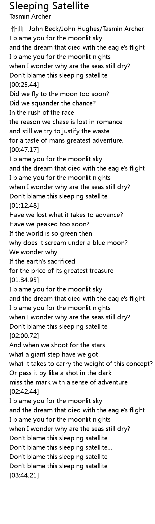 | [03:38.85] | Don' t blame this sleeping satellite |