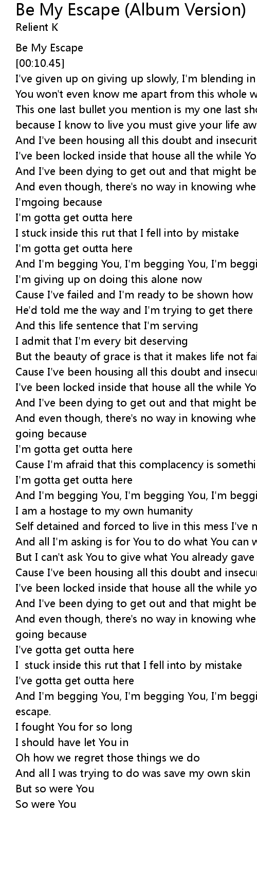 | [03:05.77] | And I'm begging You, I'm begging You, I'm begging, You to be my escape. |
