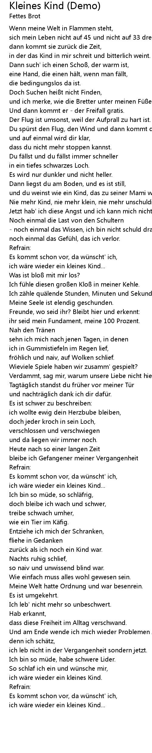 | Nie mehr Kind, nie mehr klein, nie mehr unschuldig sein. | |