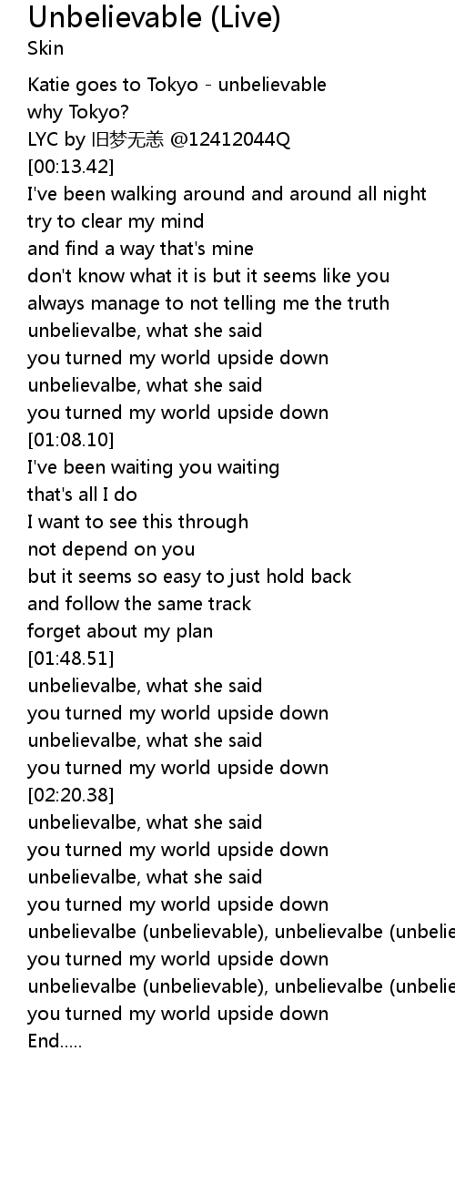 | [03:18.48] | unbelievalbe unbelievable, unbelievalbe unbelievable |