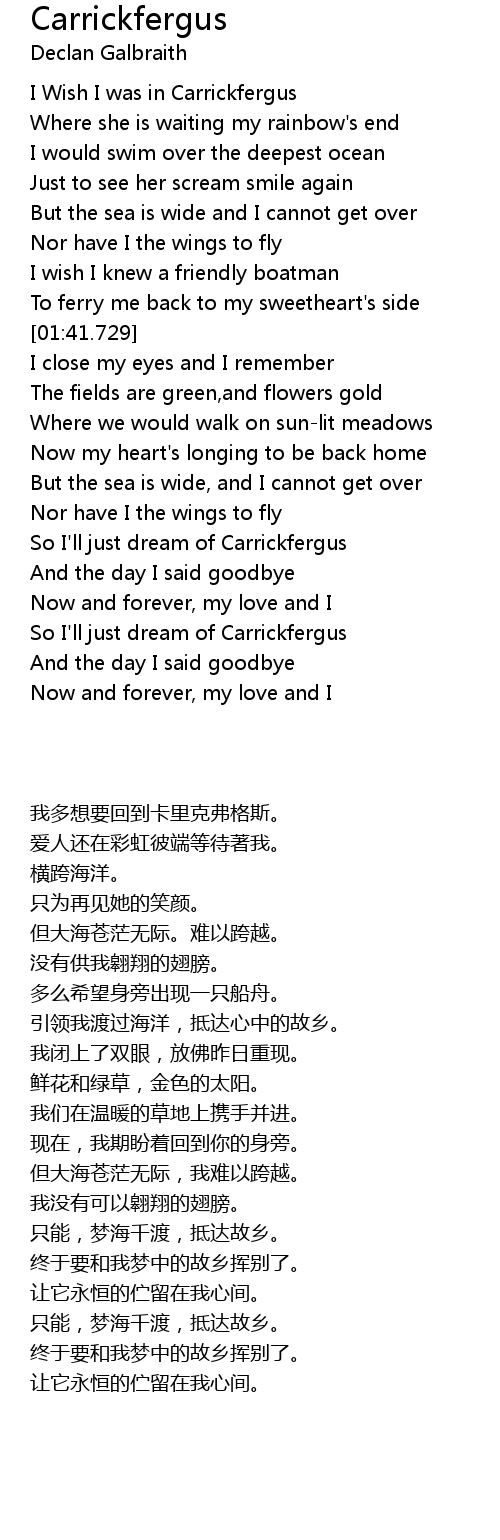 | [02:47.220] | So I' ll just dream of Carrickfergus |