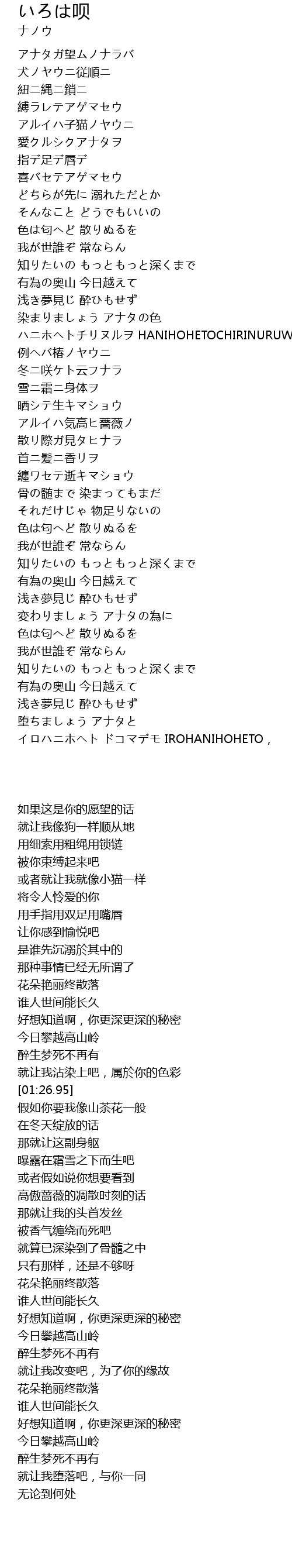 | [01:26.95] | ハニホヘトチリヌルヲ HANIHOHETOCHIRINURUWO |