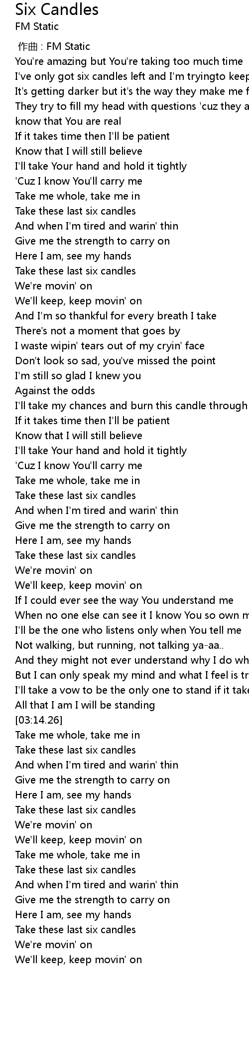 | [00:29.01] | I've only got six candles left and I'm tryingto keep this off my mind |