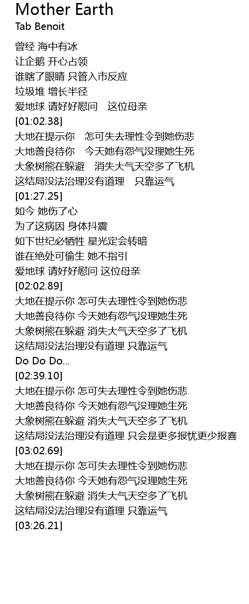 | [02:39.52] | 大地在提示你 怎可失去理性令到她伤悲 |