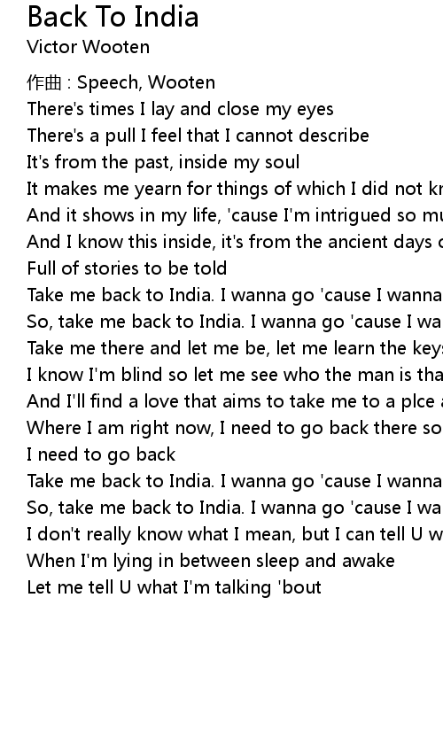 | Take me back to India. I wanna go 'cause I wanna know | |