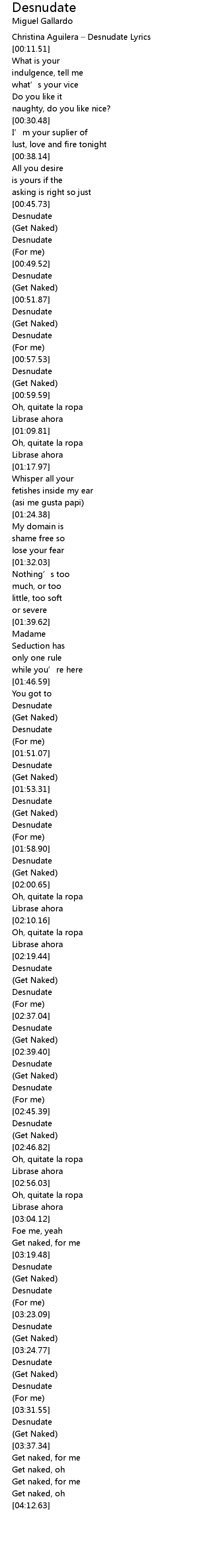 | [00:00.00] | Christina Aguilera Desnudate Lyrics |
