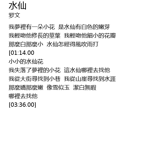| [02:37.00][01:14.00] | 啊....我夢裡的小花 水仙水仙花 |