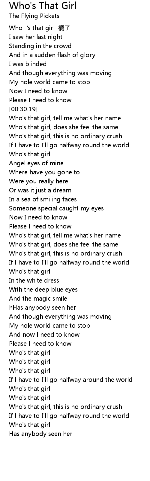 | [00:31.05] | Who's that girl, tell me what's her name |